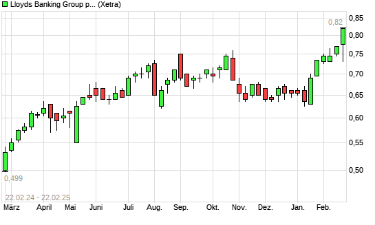 Mit dem Anstieg auf 0,81 EUR hat die Lloyds-Aktie (ISIN GB0008706128) am 21.02.2025 ein neues 5-Jahres-Hoch erreicht und damit den Kurs vom 20.02.2025 eingestellt.