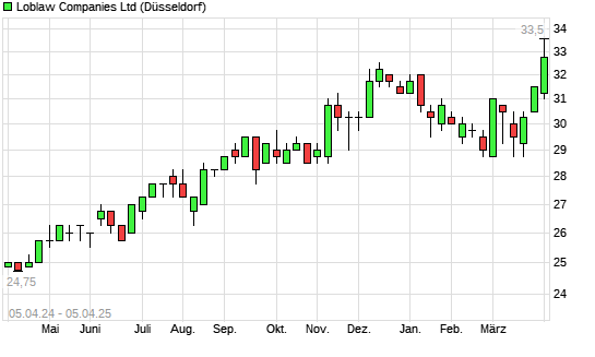 Mit dem Anstieg auf 131,00 EUR hat die Loblaw Companies-Aktie (ISIN CA5394811015) am 04.04.2025 ein neues All-Time-High erreicht und damit den Kurs vom 02.04.2025 eingestellt.