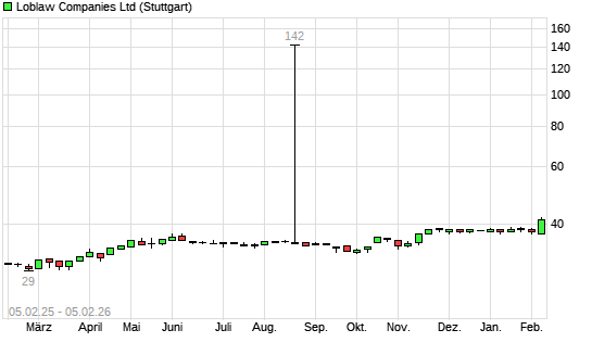 Mit dem Anstieg auf 39,80 EUR hat die Loblaw Companies-Aktie (ISIN CA5394811015) am 04.02.2026 ein neues All-Time-High erreicht und damit den Kurs vom 28.11.2025 eingestellt.