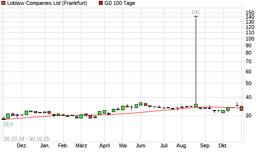 Mit dem Rücksetzer auf 33,20 EUR hat die Loblaw Companies-Aktie am 29.10.2025 die 100-Tage-Linie nach unten gekreuzt.
