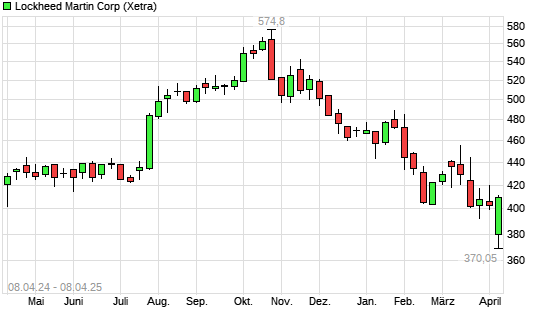 Mit dem Rücksetzer auf 393,15 EUR hat die Lockheed Martin-Aktie (ISIN US5398301094) am 07.04.2025 ein neues 12-Monats-Tief erreicht und damit den Kurs vom 24.03.2025 eingestellt.