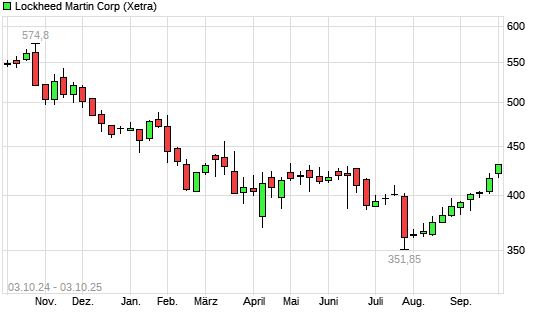 Mit dem Anstieg auf 426,70 EUR hat die Lockheed Martin-Aktie (ISIN US5398301094) am 02.10.2025 ein neues 6-Monats-Hoch erreicht und damit den Kurs vom 08.05.2025 eingestellt.