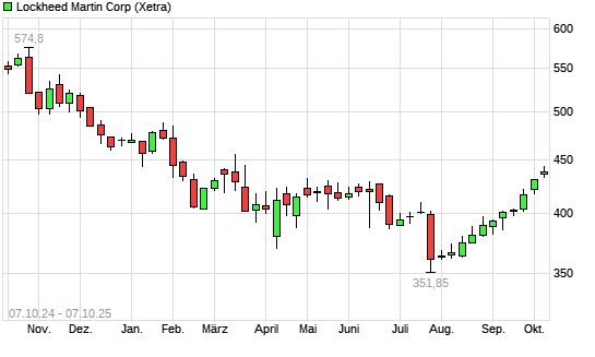 Mit dem Anstieg auf 437,15 EUR hat die Lockheed Martin-Aktie (ISIN US5398301094) am 06.10.2025 ein neues 6-Monats-Hoch erreicht und damit den Kurs vom 03.10.2025 eingestellt.