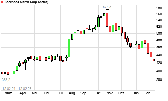 Mit dem Rücksetzer auf 425,00 EUR hat die Lockheed Martin-Aktie (ISIN US5398301094) am 12.02.2025 ein neues 6-Monats-Tief erreicht und damit den Kurs vom 06.02.2025 eingestellt.