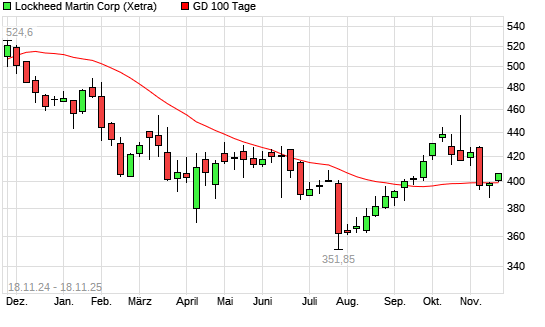 Mit dem Anstieg auf 403,00 EUR hat die Lockheed Martin-Aktie am 17.11.2025 die 100-Tage-Linie nach oben gekreuzt.