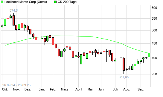 Mit dem Anstieg auf 416,50 EUR hat die Lockheed Martin-Aktie am 25.09.2025 die 200-Tage-Linie nach oben gekreuzt.