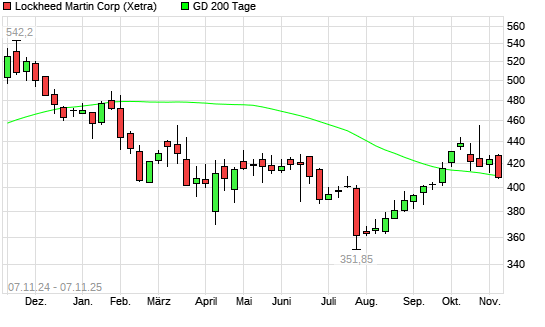 Mit dem Rücksetzer auf 404,65 EUR hat die Lockheed Martin-Aktie am 06.11.2025 die 200-Tage-Linie nach unten gekreuzt.