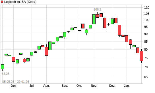 Mit dem Rücksetzer auf 72,04 EUR hat die Logitech-Aktie (ISIN CH0025751329) am 28.01.2026 ein neues 6-Monats-Tief erreicht und damit den Kurs vom 20.01.2026 eingestellt.