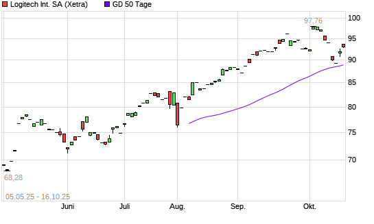 Mit dem Anstieg auf 90,92 EUR hat die Logitech-Aktie am 15.10.2025 die 50-Tage-Linie nach oben gekreuzt.