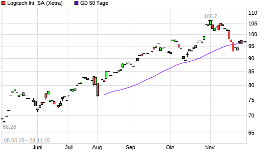 Mit dem Rücksetzer auf 95,48 EUR hat die Logitech-Aktie am 27.11.2025 die 50-Tage-Linie nach unten gekreuzt.