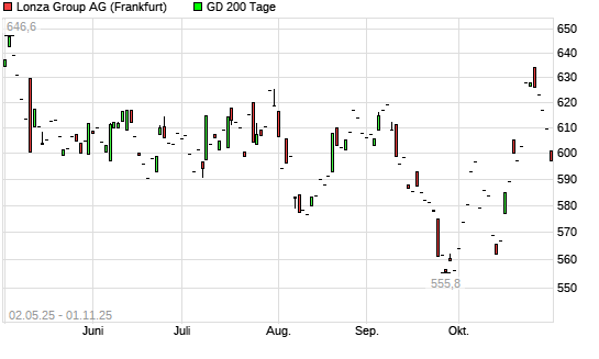 Mit dem Rücksetzer auf 597,20 EUR hat die Lonza Group-Aktie am 31.10.2025 die 200-Tage-Linie nach unten gekreuzt.
