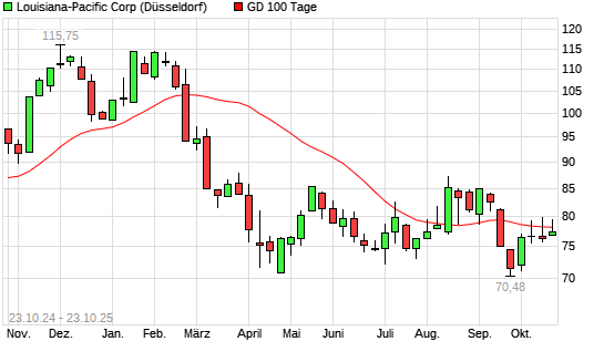 Mit dem Anstieg auf 79,30 EUR hat die Louisiana-Pacific-Aktie am 22.10.2025 die 100-Tage-Linie nach oben gekreuzt.