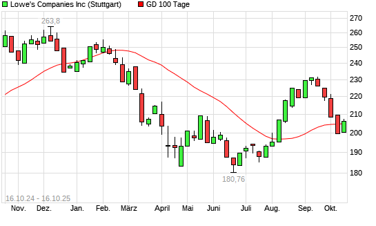 Mit dem Anstieg auf 206,80 EUR hat die Lowe's Companies-Aktie am 15.10.2025 die 100-Tage-Linie nach oben gekreuzt.