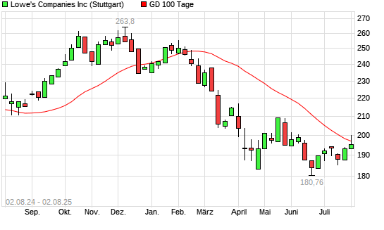 Mit dem Rücksetzer auf 194,98 EUR hat die Lowe's Companies-Aktie am 01.08.2025 die 100-Tage-Linie nach unten gekreuzt.