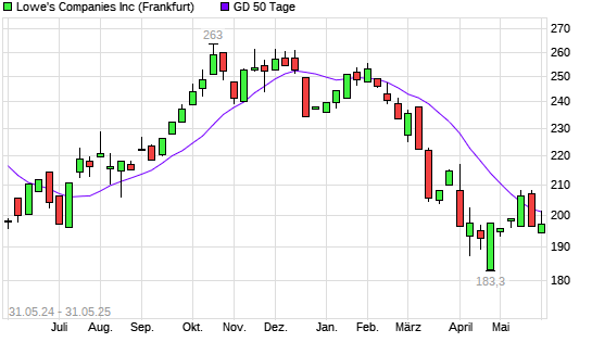 Mit dem Rücksetzer auf 197,12 EUR hat die Lowe's Companies-Aktie am 30.05.2025 die 50-Tage-Linie nach unten gekreuzt.