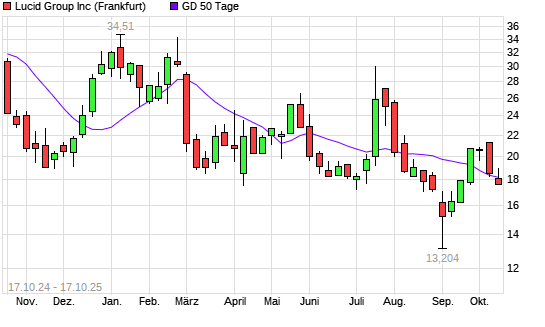 Mit dem Rücksetzer auf 17,60 EUR hat die Lucid Motors-Aktie am 16.10.2025 die 50-Tage-Linie nach unten gekreuzt.