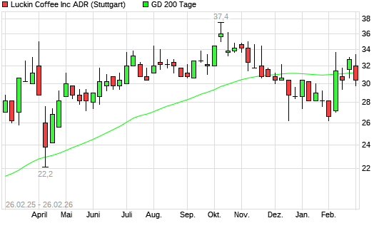 Mit dem Rücksetzer auf 31,00 EUR hat die Luckin Coffee ADR-Aktie am 25.02.2026 die 200-Tage-Linie nach unten gekreuzt.