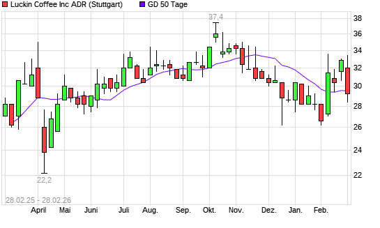 Mit dem Rücksetzer auf 29,20 EUR hat die Luckin Coffee ADR-Aktie am 27.02.2026 die 50-Tage-Linie nach unten gekreuzt.