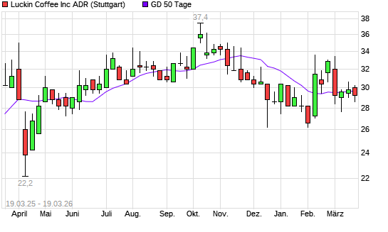 Mit dem Rücksetzer auf 29,20 EUR hat die Luckin Coffee ADR-Aktie am 18.03.2026 die 50-Tage-Linie nach unten gekreuzt.