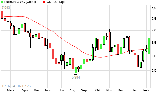 Mit dem Anstieg auf 6,55 EUR hat die Lufthansa-Aktie am 06.02.2025 die 100-Tage-Linie nach oben gekreuzt.