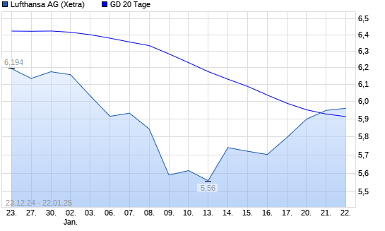 Mit dem Anstieg auf 5,96 EUR hat die Lufthansa-Aktie am 21.01.2025 die 20-Tage-Linie nach oben gekreuzt.