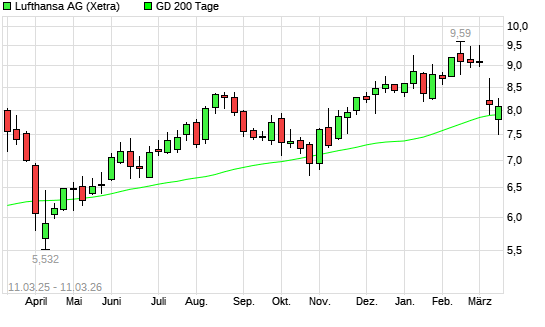 Mit dem Anstieg auf 8,13 EUR hat die Lufthansa-Aktie am 10.03.2026 die 200-Tage-Linie nach oben gekreuzt.