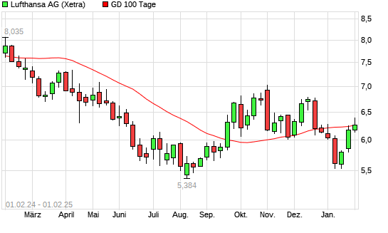 Mit dem Rücksetzer auf 6,24 EUR hat die Lufthansa-Aktie am 31.01.2025 die 100-Tage-Linie nach unten gekreuzt.
