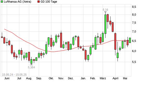 Mit dem Rücksetzer auf 6,43 EUR hat die Lufthansa-Aktie am 14.05.2025 die 100-Tage-Linie nach unten gekreuzt.