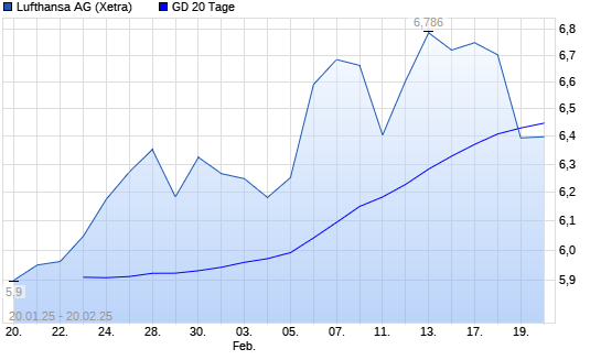 Mit dem Rücksetzer auf 6,40 EUR hat die Lufthansa-Aktie am 19.02.2025 die 20-Tage-Linie nach unten gekreuzt.