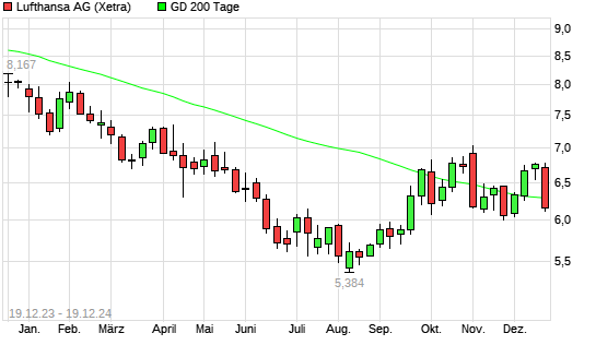 Mit dem Rücksetzer auf 6,24 EUR hat die Lufthansa-Aktie am 18.12.2024 die 200-Tage-Linie nach unten gekreuzt.