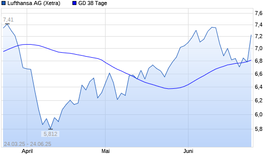Mit dem Rücksetzer auf 6,76 EUR hat die Lufthansa-Aktie am 23.06.2025 die 38-Tage-Linie nach unten gekreuzt.