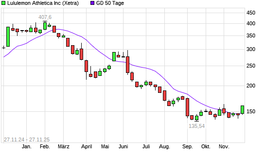 Mit dem Anstieg auf 157,70 EUR hat die Lululemon Athletica-Aktie am 26.11.2025 die 50-Tage-Linie nach oben gekreuzt.