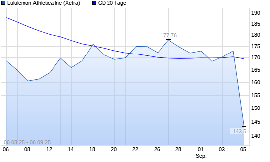 Mit dem Rücksetzer auf 143,34 EUR hat die Lululemon Athletica-Aktie am 05.09.2025 die 20-Tage-Linie nach unten gekreuzt.