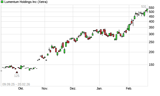 Mit dem Anstieg auf 535,00 EUR hat die Lumentum-Aktie (ISIN US55024U1097) am 19.02.2026 ein neues All-Time-High erreicht und damit den Kurs vom 18.02.2026 eingestellt.