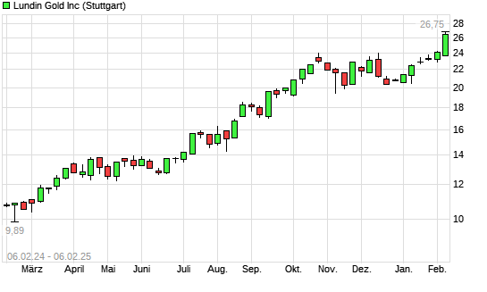 Mit dem Anstieg auf 26,70 EUR hat die Lundin Gold-Aktie (ISIN CA5503711080) am 05.02.2025 ein neues All-Time-High erreicht und damit den Kurs vom 22.10.2007 eingestellt.