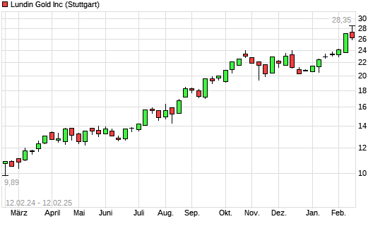 Mit dem Anstieg auf 28,00 EUR hat die Lundin Gold-Aktie (ISIN CA5503711080) am 11.02.2025 ein neues All-Time-High erreicht und damit den Kurs vom 10.02.2025 eingestellt.