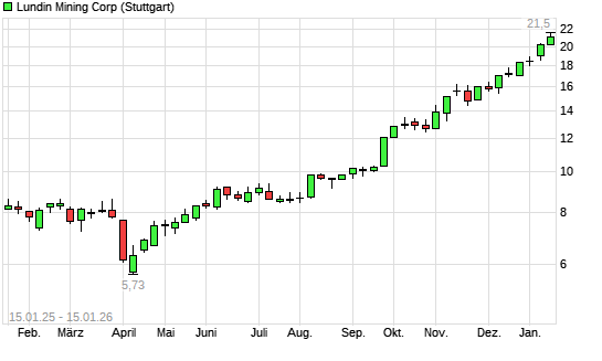 Mit dem Anstieg auf 21,02 EUR hat die Lundin Mining-Aktie (ISIN CA5503721063) am 14.01.2026 ein neues All-Time-High erreicht und damit den Kurs vom 13.01.2026 eingestellt.