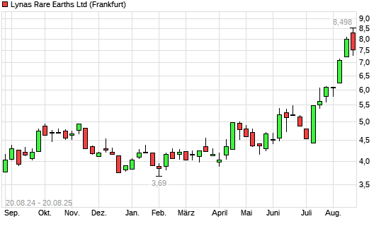 Mit dem Anstieg auf 8,41 EUR hat die Lynas-Aktie (ISIN AU000000LYC6) am 19.08.2025 ein neues 10-Jahres-Hoch erreicht und damit den Kurs vom 18.08.2025 eingestellt.