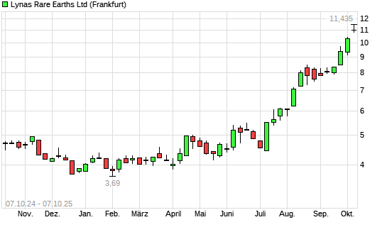 Mit dem Anstieg auf 11,42 EUR hat die Lynas-Aktie (ISIN AU000000LYC6) am 06.10.2025 ein neues 10-Jahres-Hoch erreicht und damit den Kurs vom 03.10.2025 eingestellt.