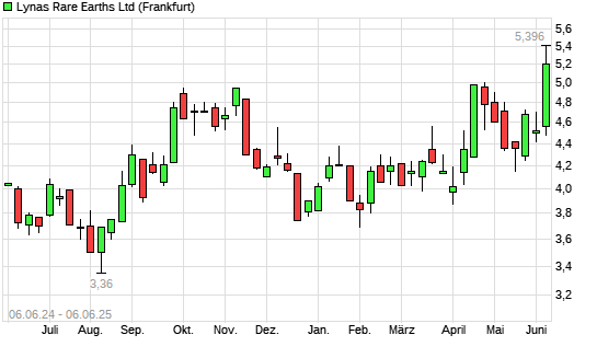 Mit dem Anstieg auf 5,40 EUR hat die Lynas-Aktie (ISIN AU000000LYC6) am 05.06.2025 ein neues 12-Monats-Hoch erreicht und damit den Kurs vom 17.04.2025 eingestellt.