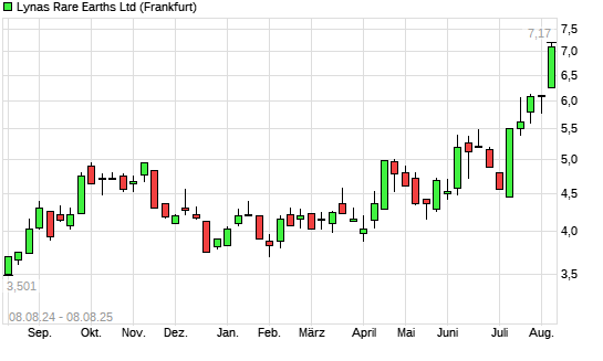 Mit dem Anstieg auf 6,90 EUR hat die Lynas-Aktie (ISIN AU000000LYC6) am 07.08.2025 ein neues 12-Monats-Hoch erreicht und damit den Kurs vom 06.08.2025 eingestellt.