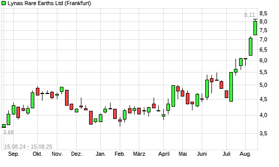 Mit dem Anstieg auf 7,68 EUR hat die Lynas-Aktie (ISIN AU000000LYC6) am 14.08.2025 ein neues 3-Jahres-Hoch erreicht und damit den Kurs vom 13.08.2025 eingestellt.