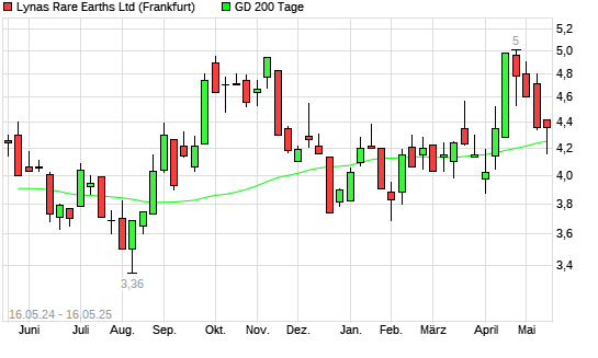 Mit dem Rücksetzer auf 4,23 EUR hat die Lynas-Aktie am 15.05.2025 die 200-Tage-Linie nach unten gekreuzt.