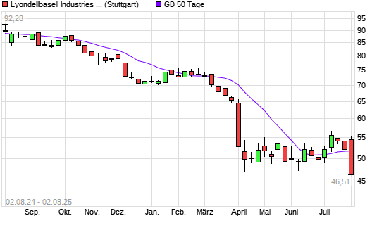 Mit dem Rücksetzer auf 47,25 EUR hat die Lyondellbasell Industries-Aktie am 01.08.2025 die 50-Tage-Linie nach unten gekreuzt.