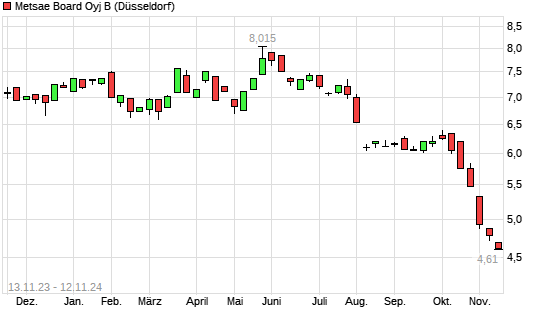 Mit dem Rücksetzer auf 4,68 EUR hat die M-Real-Aktie (ISIN FI0009000665) am 11.11.2024 ein neues 3-Jahres-Tief erreicht und damit den Kurs vom 07.11.2024 eingestellt.