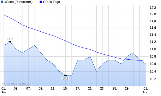 Mit dem Rücksetzer auf 10,70 EUR hat die M3-Aktie am 31.07.2025 die 20-Tage-Linie nach unten gekreuzt.