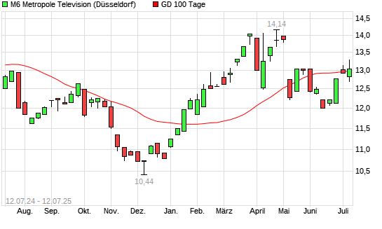 Mit dem Rücksetzer auf 13,00 EUR hat die M6 Metropole Television-Aktie am 11.07.2025 die 100-Tage-Linie nach unten gekreuzt.