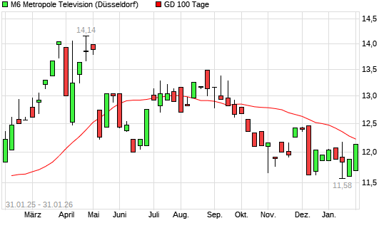 Mit dem Rücksetzer auf 12,02 EUR hat die M6 Metropole Television-Aktie am 30.01.2026 die 100-Tage-Linie nach unten gekreuzt.
