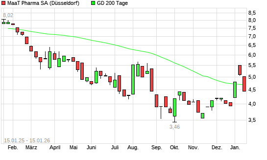 Mit dem Rücksetzer auf 4,55 EUR hat die MAAT PHARMA-Aktie am 14.01.2026 die 200-Tage-Linie nach unten gekreuzt.