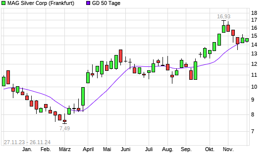 Mit dem Rücksetzer auf 14,37 EUR hat die MAG Silver Corp.-Aktie am 25.11.2024 die 50-Tage-Linie nach unten gekreuzt.